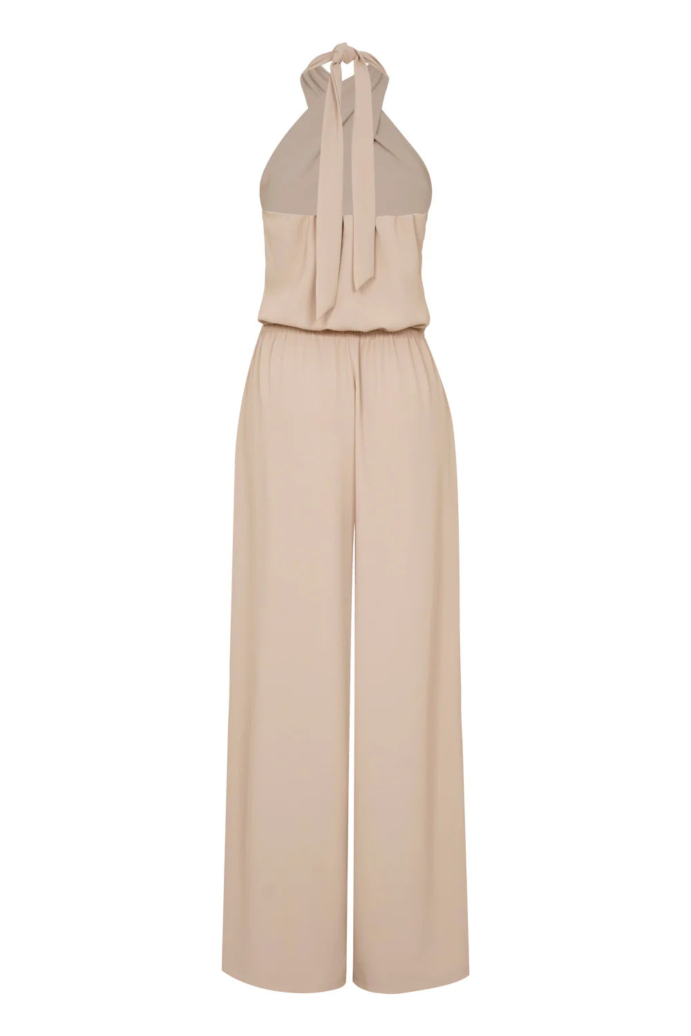 Enterizo celeste taupe. Su escote halter cruzado aporta un aire elegante y femenino, mientras que la espalda descubierta con amarre ancho le da un toque moderno.